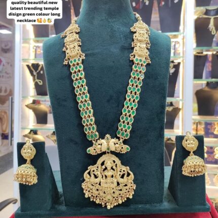 This RS Jewellers Artificial Long Haram Necklace set is a South Indian Temple Jewelry, these artificial harams are crafted from gold-plated brass and feature intricate designs depicting the temple. for more information click here