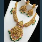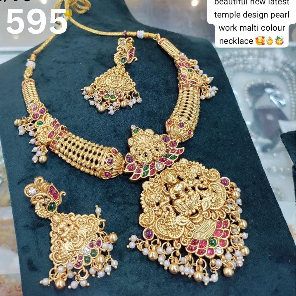 This RS Jewellers Imitation Temple Jewelry Necklace Set set is a South Indian Temple Jewelry, these artificial harams are crafted from gold-plated brass and feature intricate designs depicting the temple. for more information Please contact us