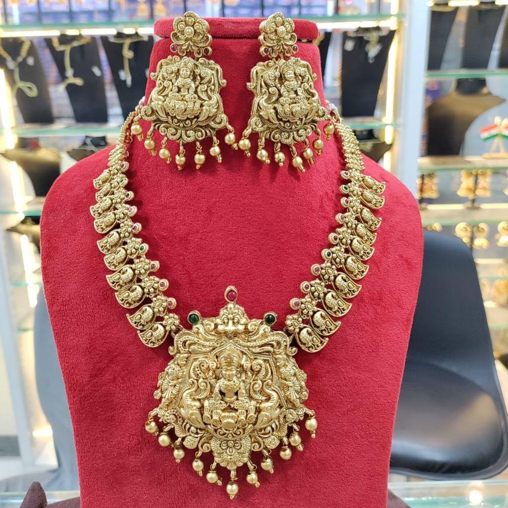 This RS Jewellers South Indian Long Haram Necklace Set set is a South Indian Temple Jewelry, these artificial harams are crafted from gold-plated brass and feature intricate designs depicting the temple. for more information please contact us
